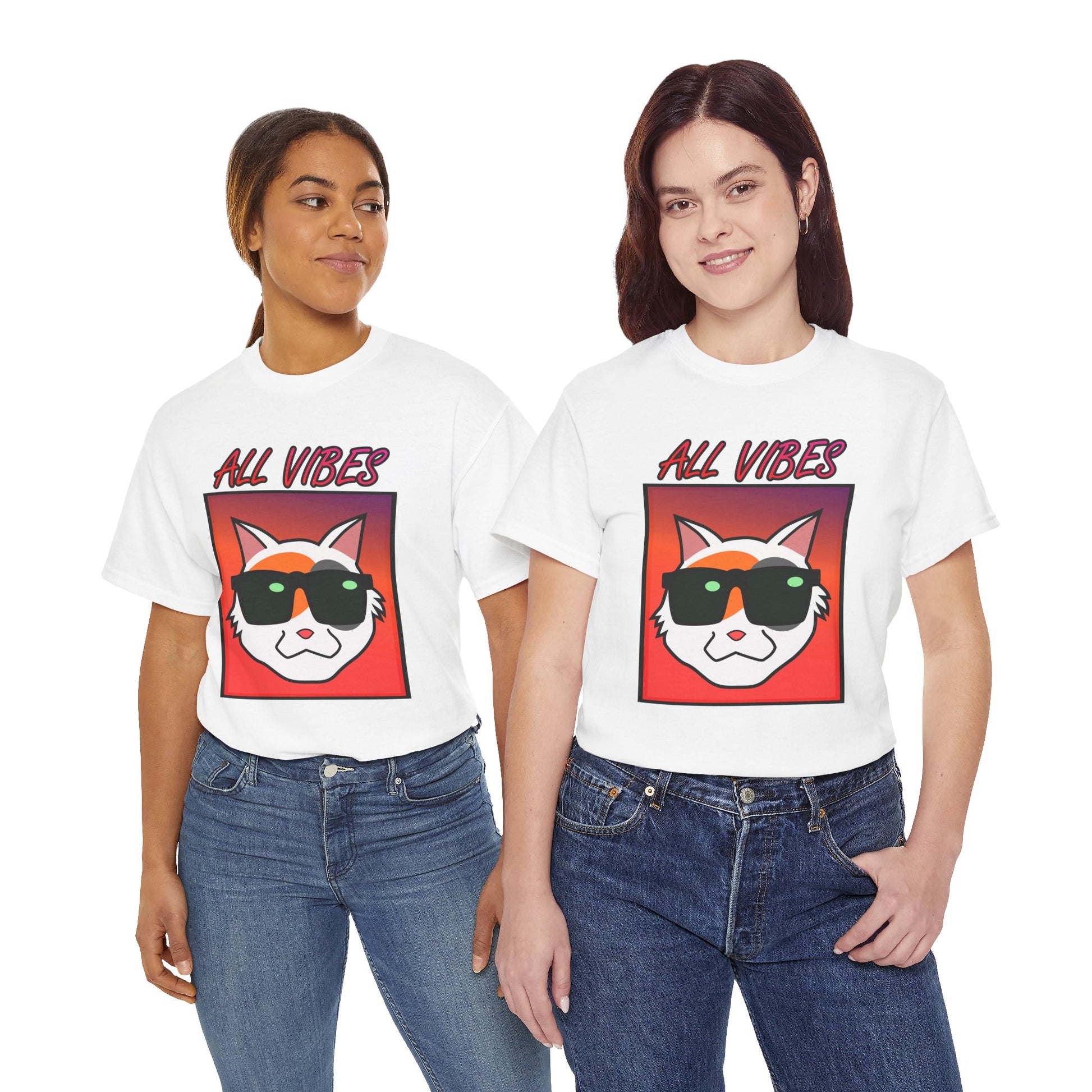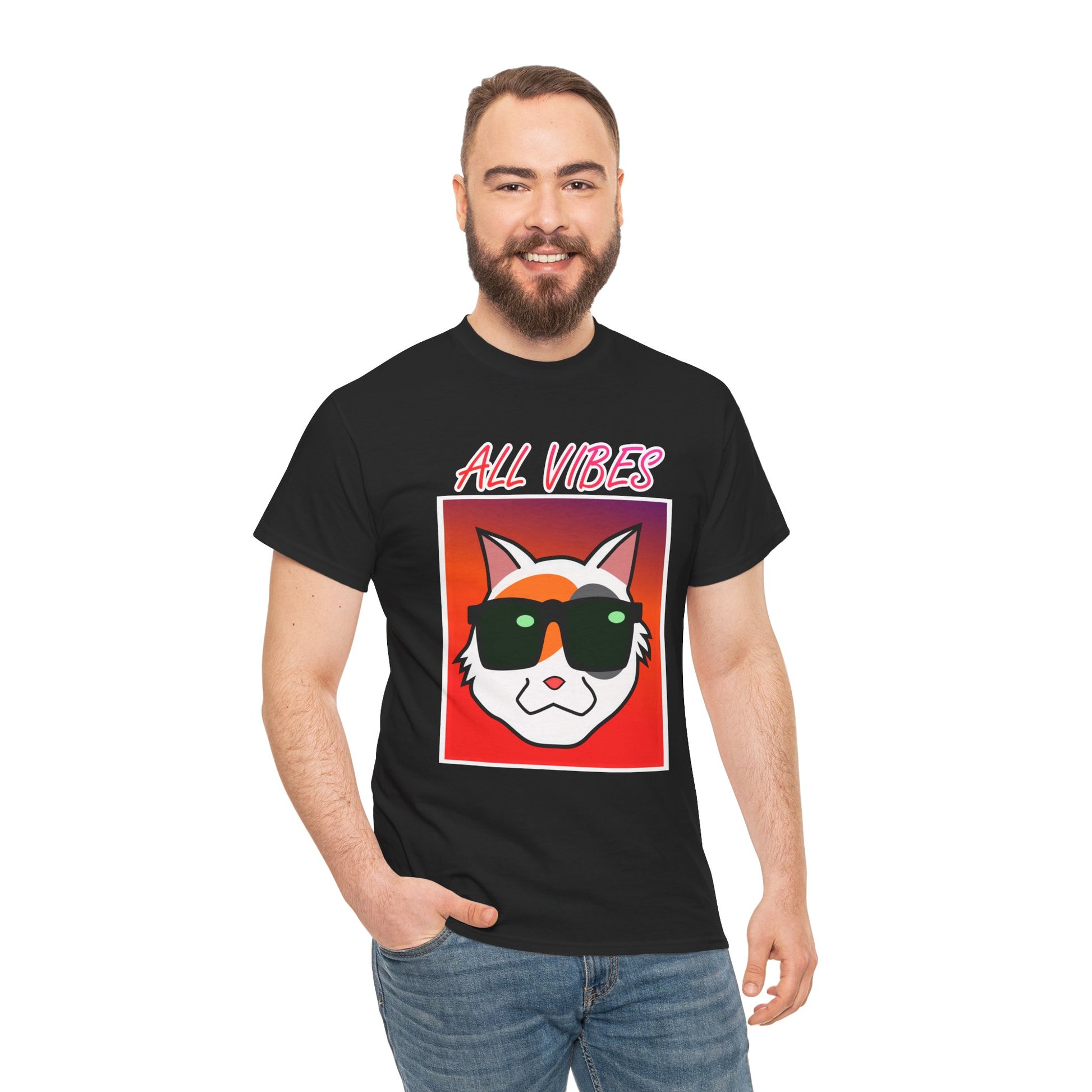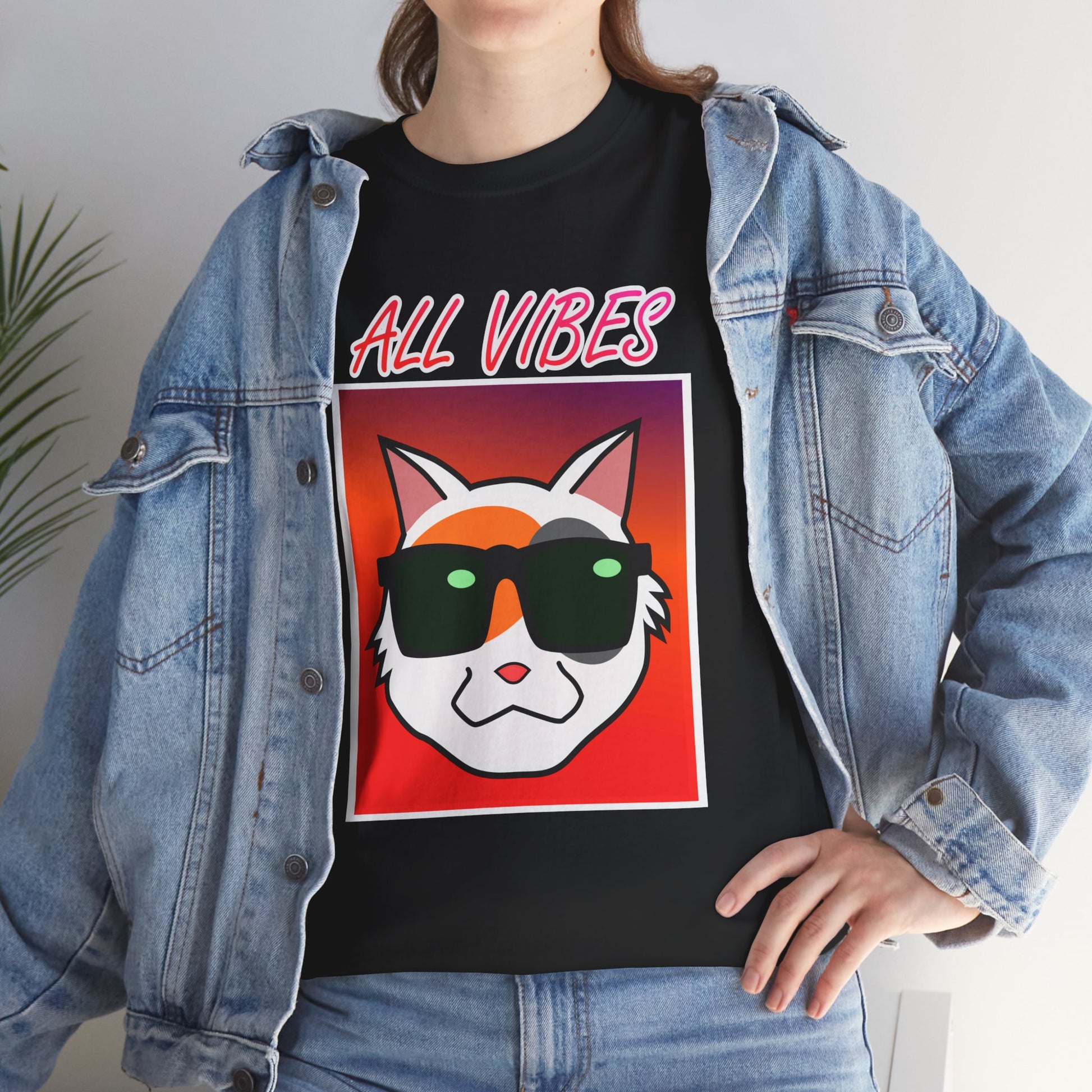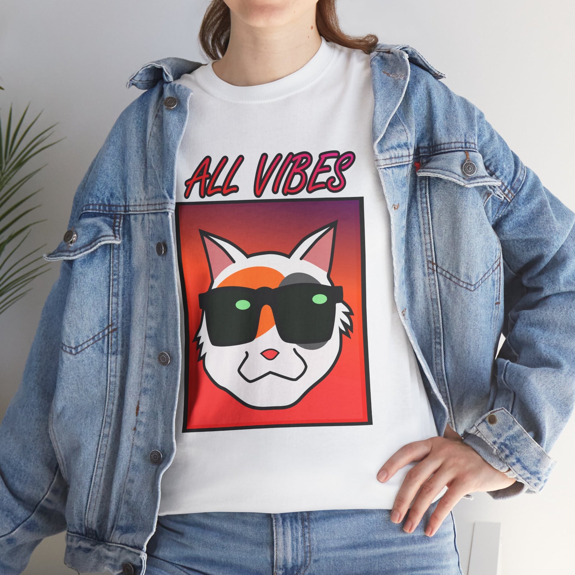 This tee features a cool cat with sunglasses against a colorful gradient and the text "All Vibes." It exudes a fun and laid-back vibe, perfect for cat lovers and anyone who enjoys a relaxed style. Ideal for casual wear, lounging at home, and attending casual gatherings. Great for cat lovers, young adults, and anyone looking to add a touch of fun to their wardrobe. Perfect for birthdays, summer parties, and casual days out.