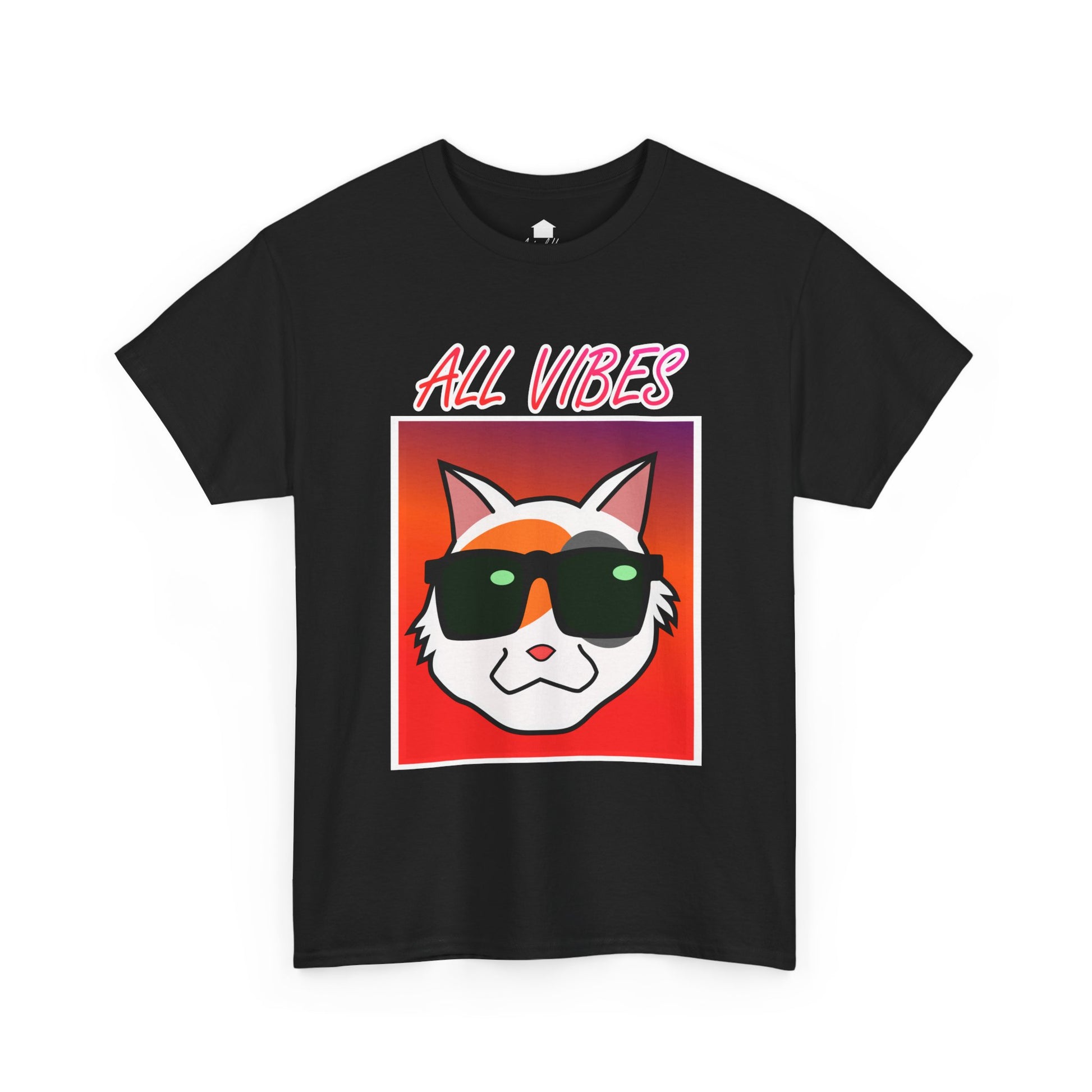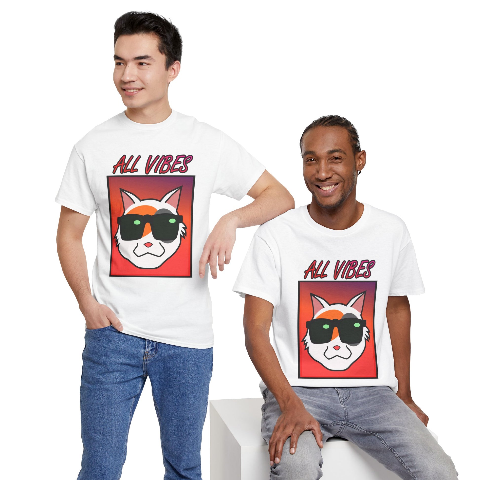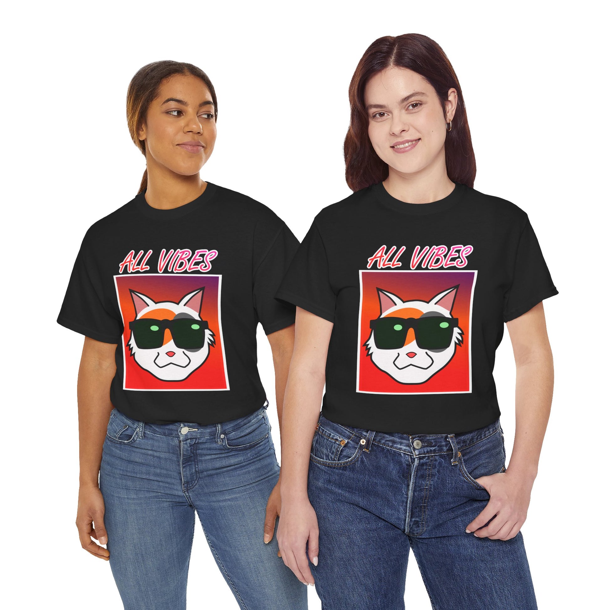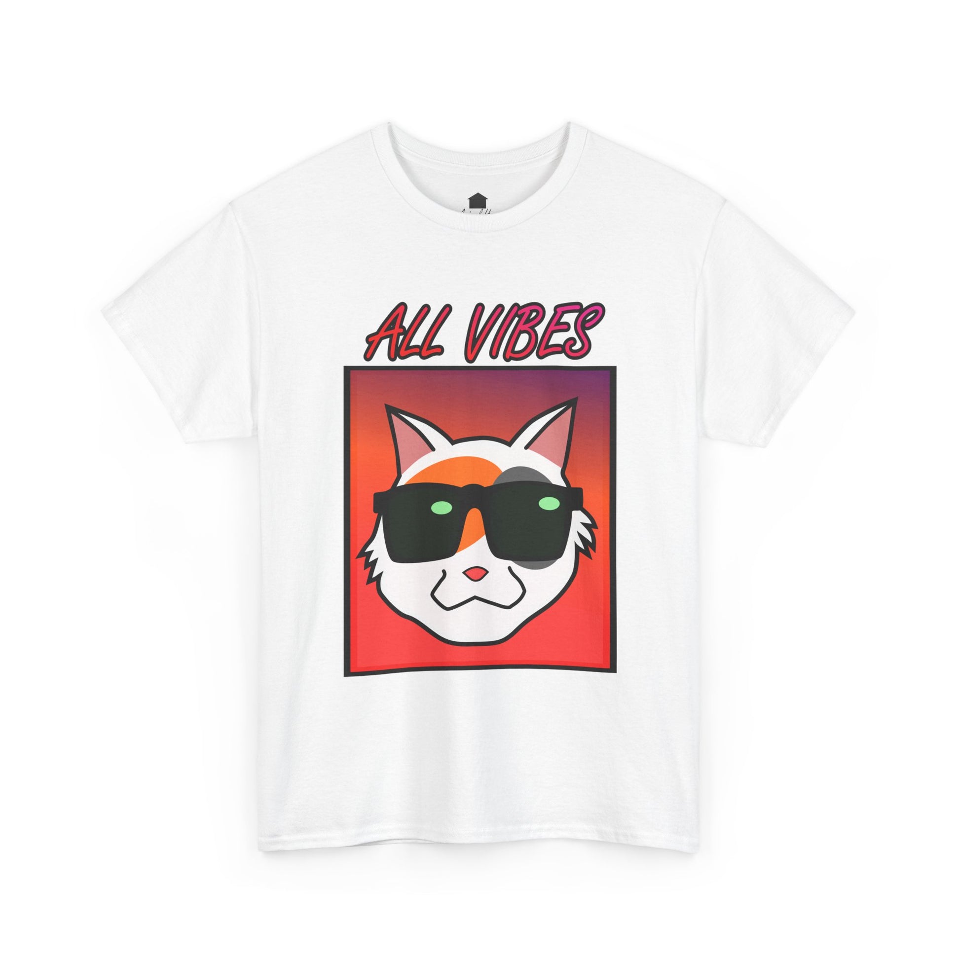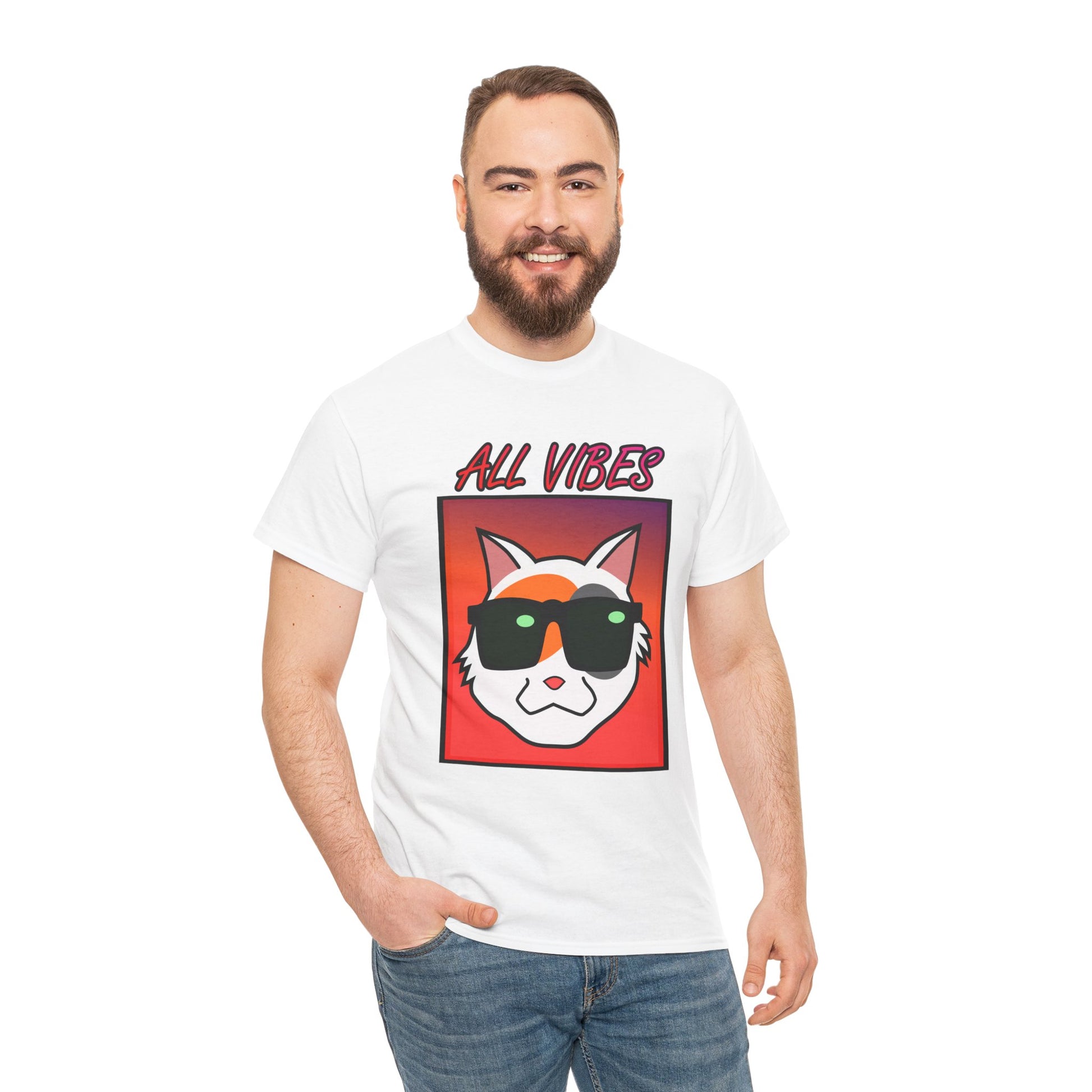 This tee features a cool cat with sunglasses against a colorful gradient and the text "All Vibes." It exudes a fun and laid-back vibe, perfect for cat lovers and anyone who enjoys a relaxed style. Ideal for casual wear, lounging at home, and attending casual gatherings. Great for cat lovers, young adults, and anyone looking to add a touch of fun to their wardrobe. Perfect for birthdays, summer parties, and casual days out.